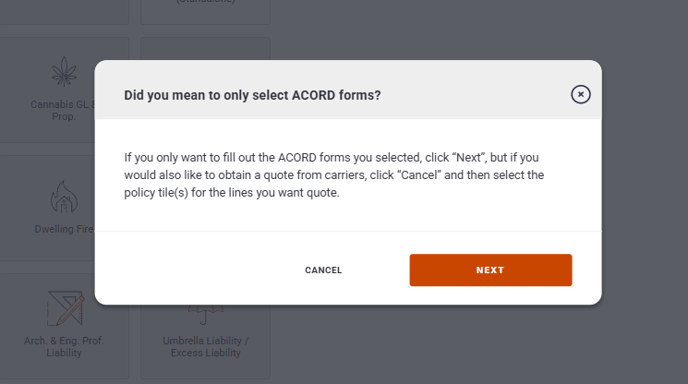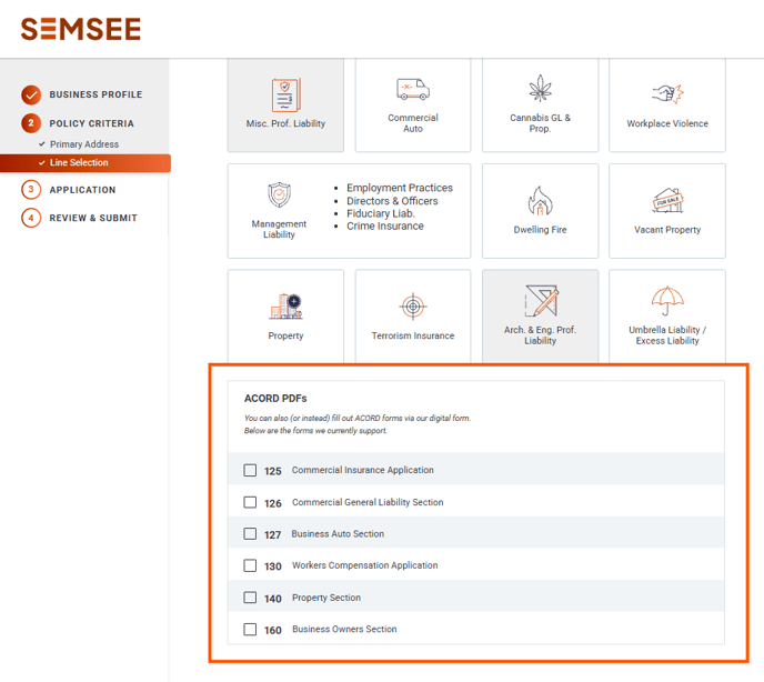 Scroll to the bottom of the page and select the ACORD forms you want.