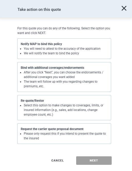 Click Take Action to move your quote forward. Depending on the carrier and quote status, you’ll see one or more of these options: